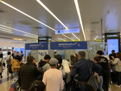 列に並んでる間に、アエロフロートの乗り継ぎに失敗した時の対応と、体験記を調べました。